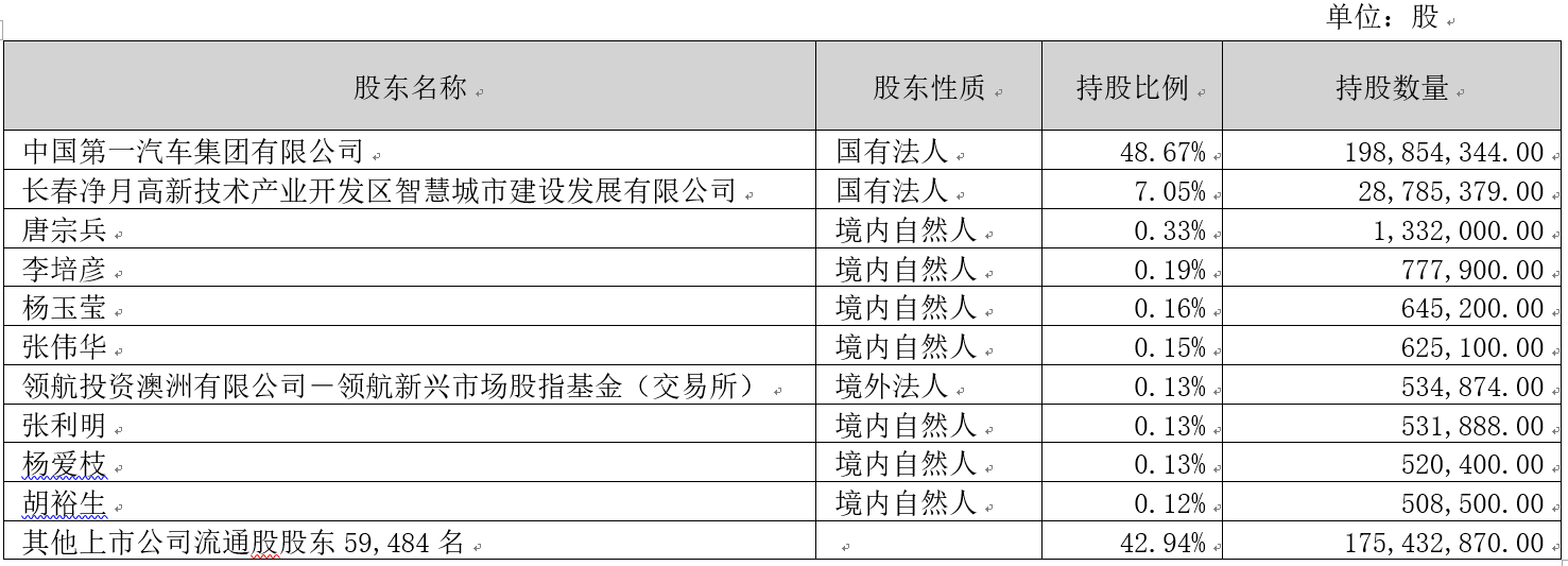 Z6尊龙官方中国入口信息技术股份有限公司(以下简称“公司”)2008年5月9日在深圳交易所挂牌上市,简称“Z6尊龙官方中国入口信息”,代码为:002232,目前为深交所主板上市公司。截至2022年9月30日,公司共有股东59,494名,公司控股股东及实际控制人为中国第一汽车集团有限公司,具体股权结构如下表: